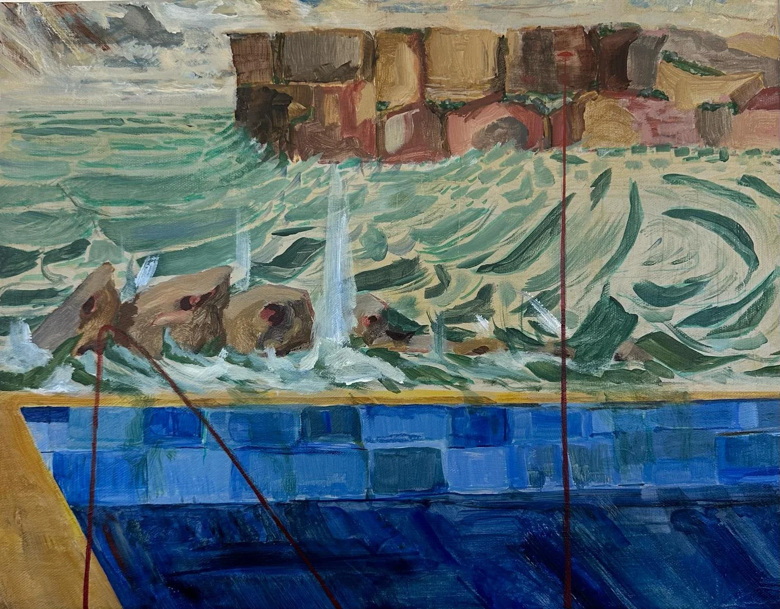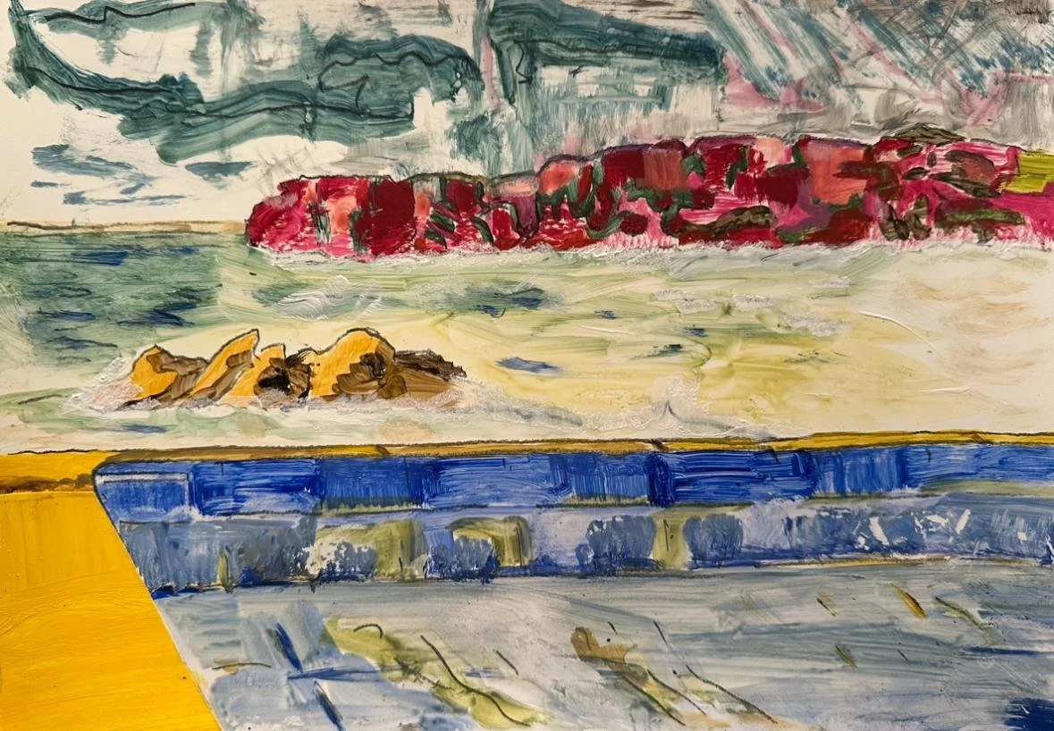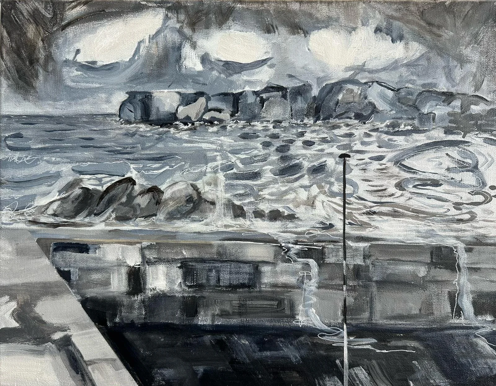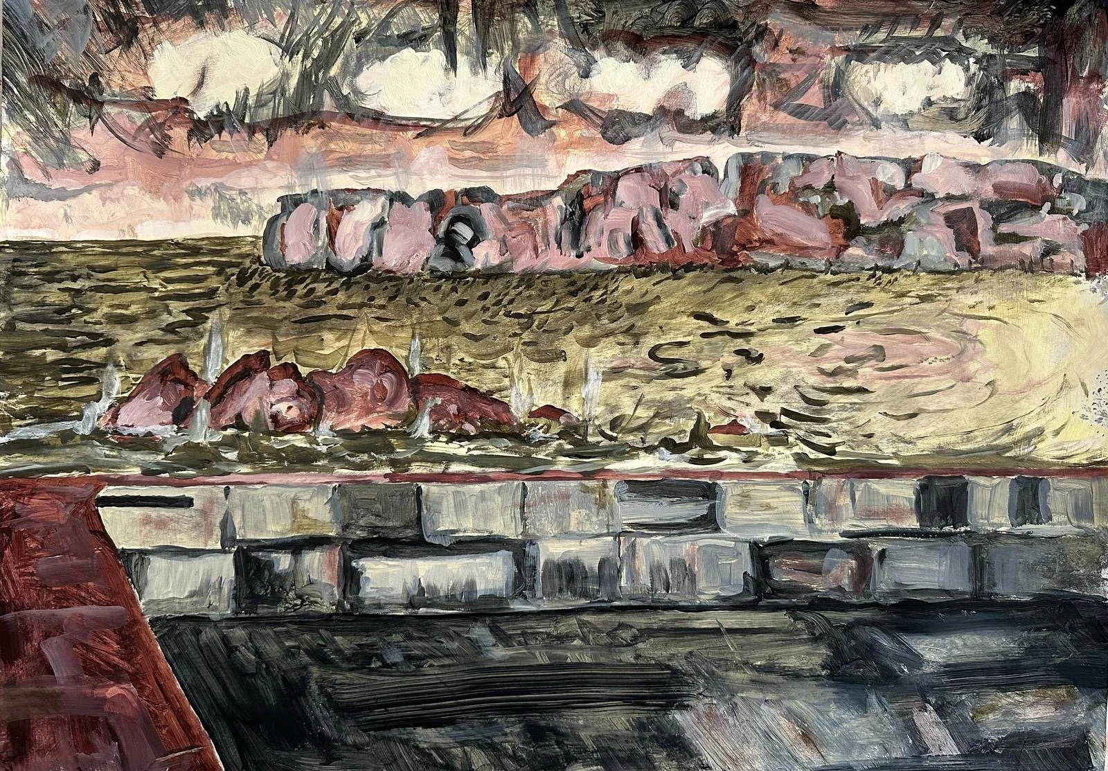 An empty ocean pool is a portal to another world. This intense and almost daily interaction with a place, documents the artist’s desire to connect deeply to her Sydney environment of Freshwater on the Northern Beaches. This enquiry has allowed her to follow an authentic expression of present moment experience when outside of Hill End. The placement of the flag pole, cliff lines and other key elements continues to explore the tension between worlds which is intrinsic to Julie’s experience. See more below to access work shown at Salamanca Arts Centre, Hobart, Easter 2025.