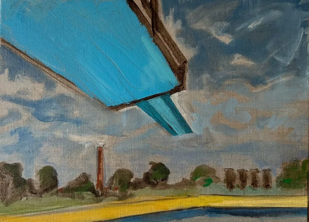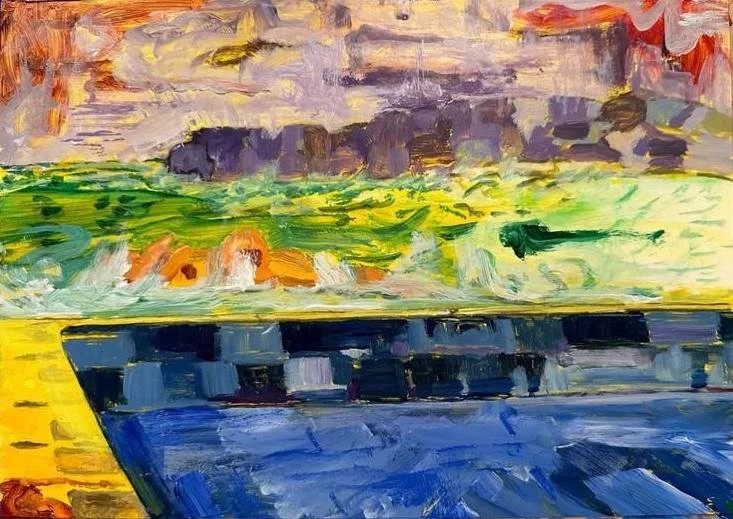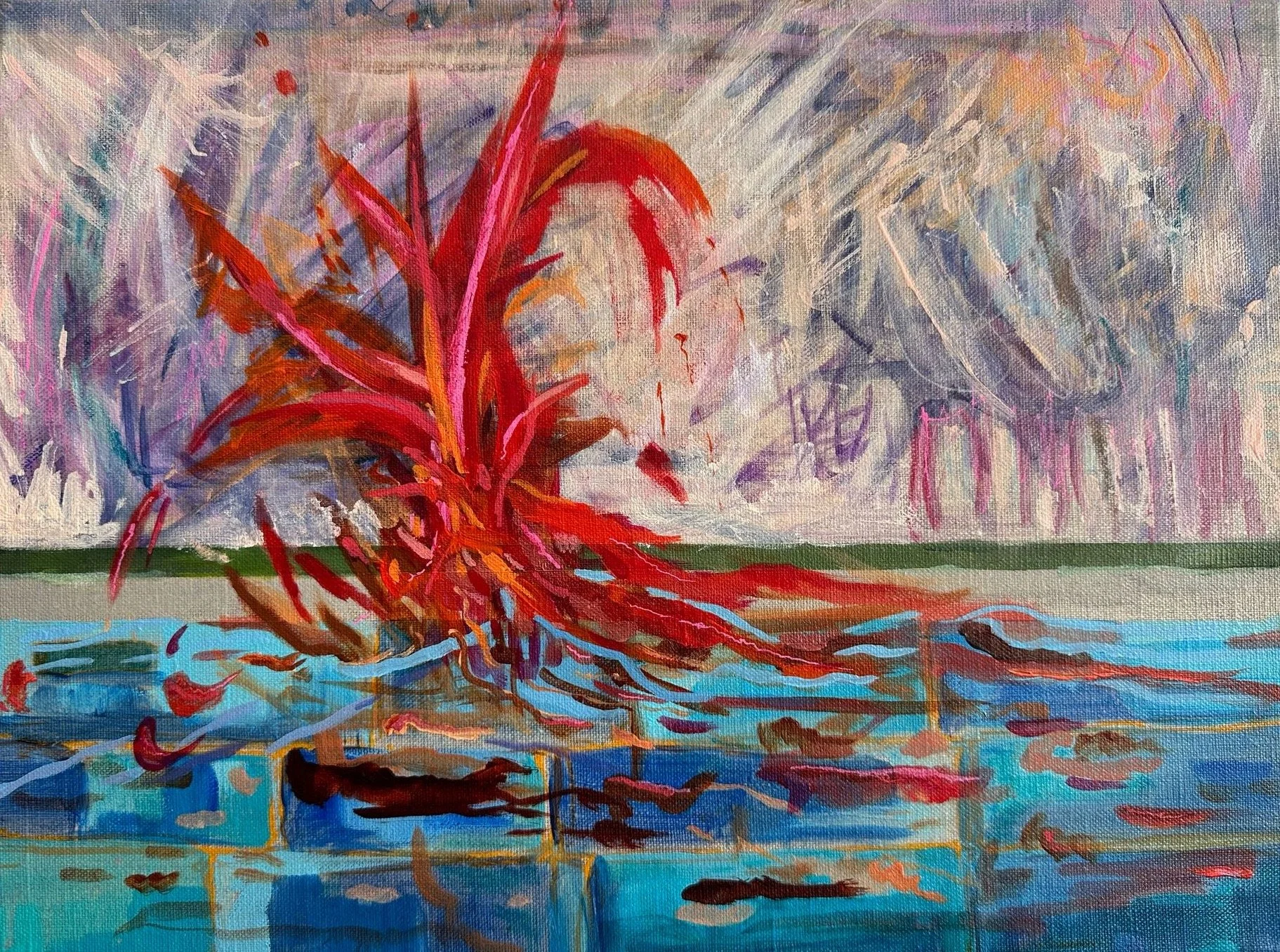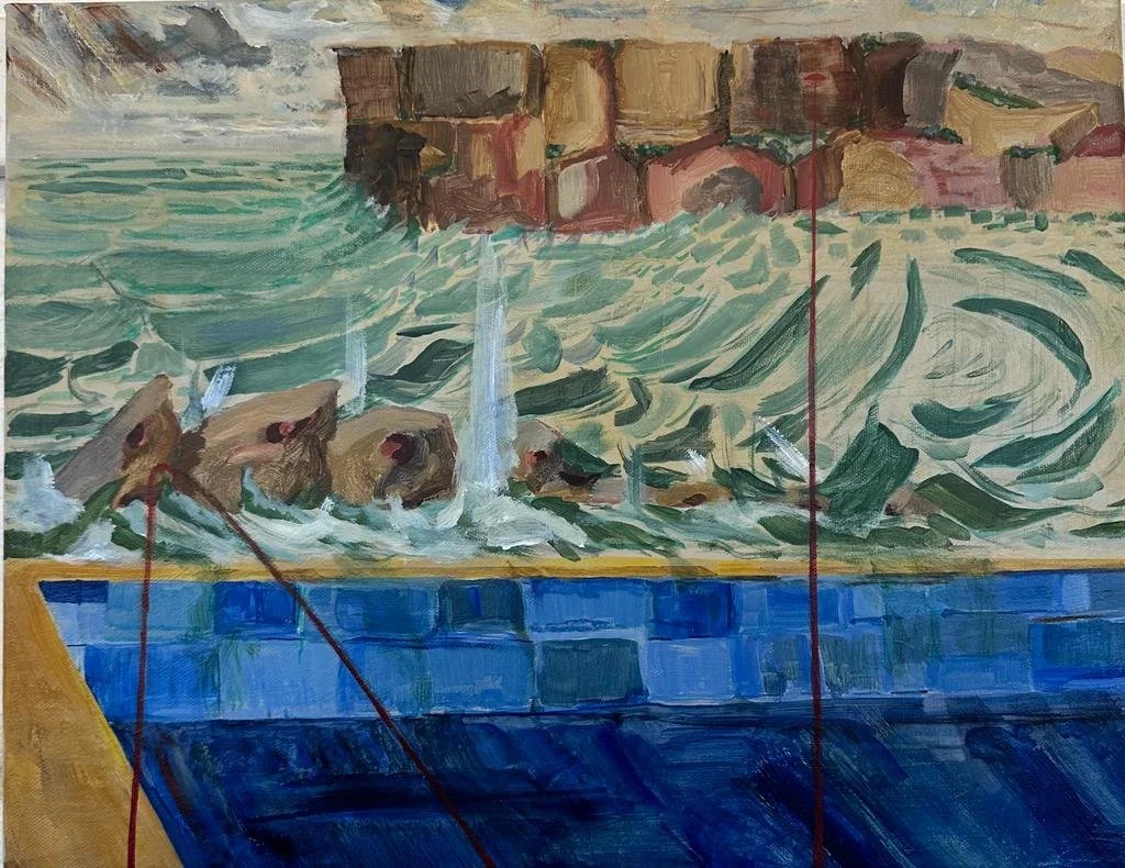 An empty ocean pool is a portal to another world. This intense and almost daily interaction with a place, documents the artist’s desire to connect deeply to her Sydney environment of Freshwater on the Northern Beaches. This enquiry has allowed her to follow an authentic expression of present moment experience when outside of Hill End. The placement of the flag pole, cliff lines and other key elements continues to explore the tension between worlds which is intrinsic to Julie’s experience. See more below to access work shown at Salamanca Arts Centre, Hobart, Easter 2025.